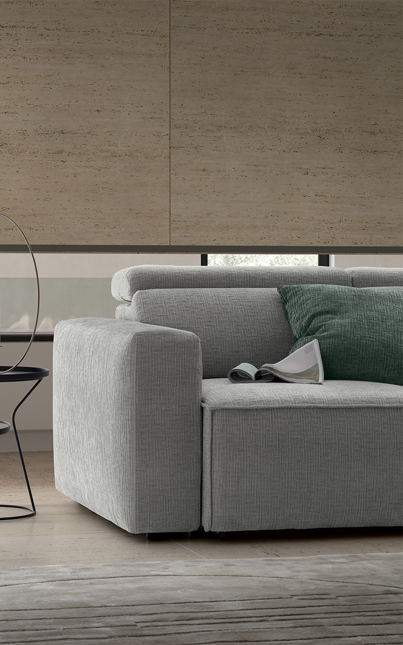 Il divano Hill è la soluzione perfetta per chi cerca un’estetica contemporanea e lineare senza rinunciare a un’esperienza di relax completamente personalizzabile. Il suo design essenziale, definito da geometrie pulite, nasconde un’anima versatile che si adatta a ogni desiderio di comfort. Con un semplice gesto, le sedute estraibili scorrono in avanti per ampliare lo spazio e creare un’invitante isola di benessere. A tutto questo si aggiungono i poggiatesta regolabili.